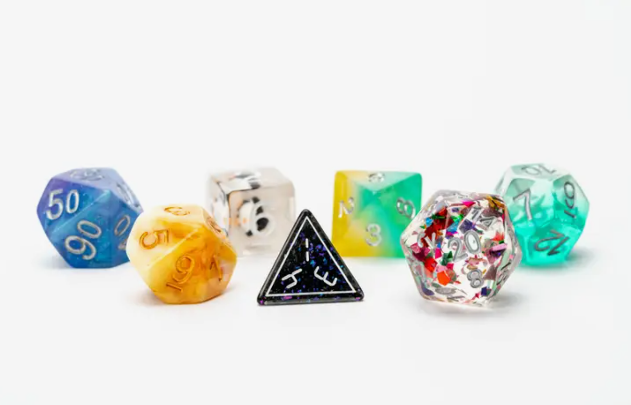 Everyone loves a blind pack! Now you can unwrap and adopt a full set of mixed dice and bring them home. These dice are one-of-a-kind including a mix of colors and effects. The ultimate sample pack for the dice goblin in your party!