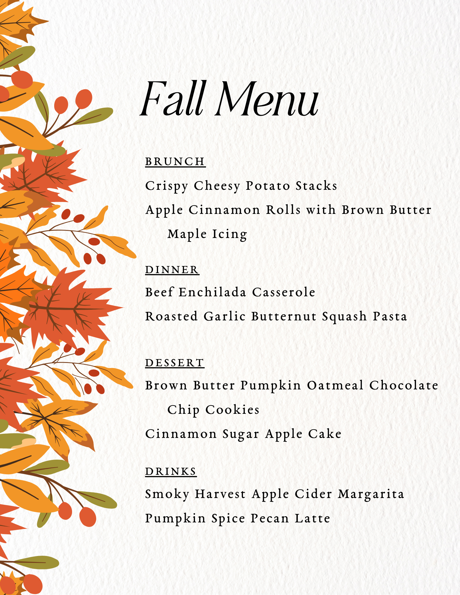 - Recipe card in either Brunch, Dinner, Dessert or Drink options - see photos for current menu selection
