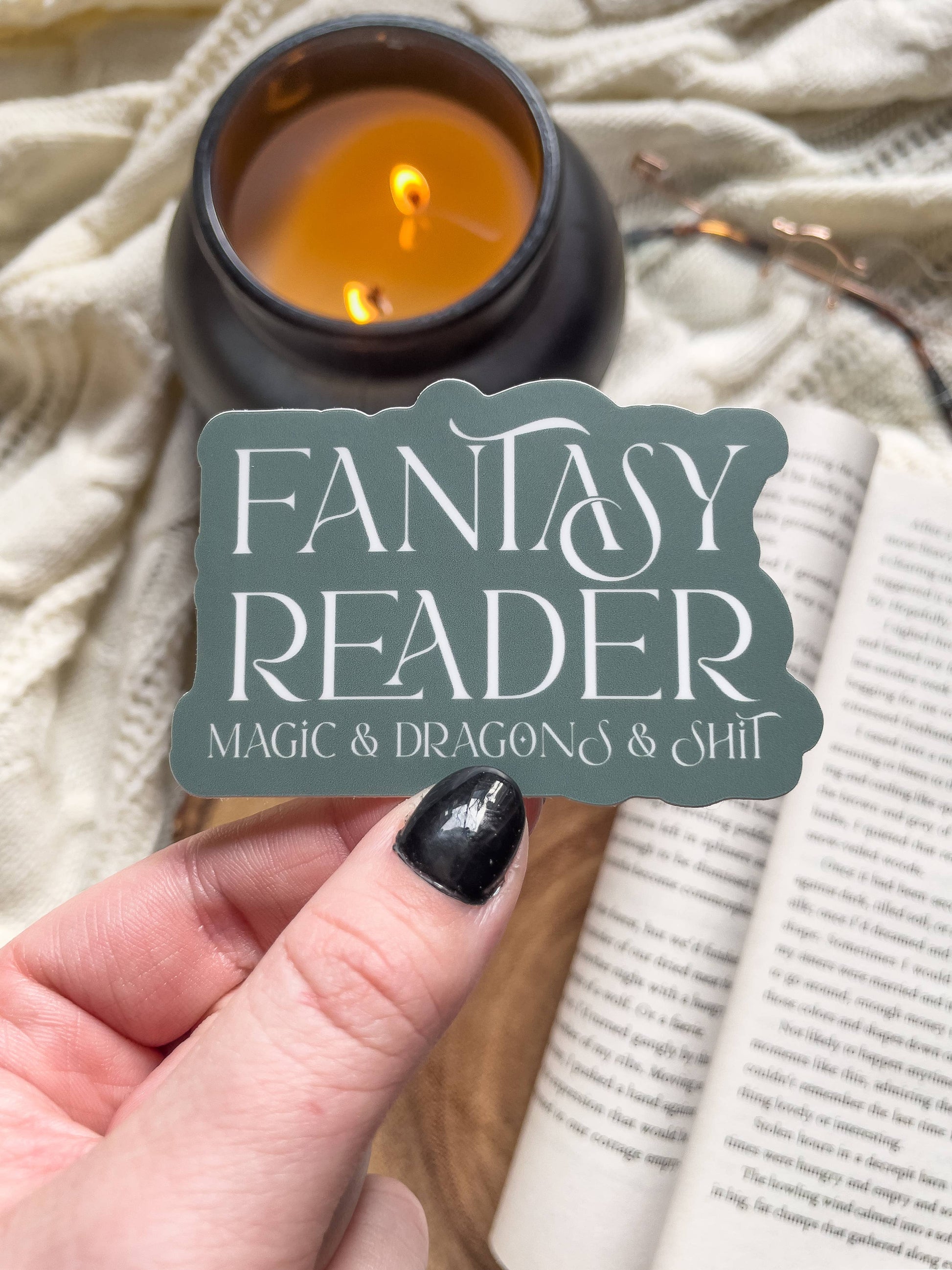 Fantasy Reader | Magic & Dragons & Shit Vinyl Sticker: Sage Green